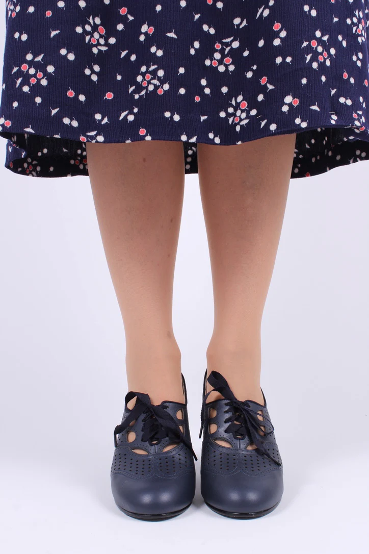 This everyday Oxford high heel combines vintage elegance with modern comfort. Featuring an ultra-feminine, medium-height Spanish heel, it exudes the charm of the early 1930s. The iconic cut-out and perforation pattern adds a distinct 30s touch, while wide grosgrain ribbon laces and edges complete the look with timeless sophistication.