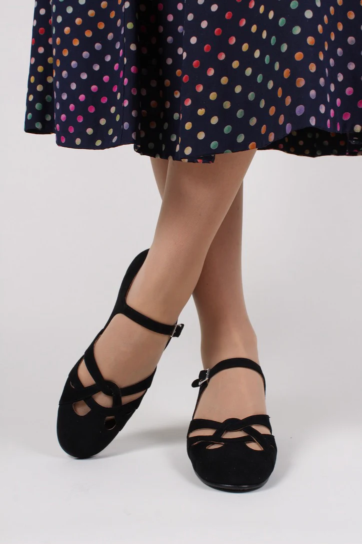 Cute and feminine everyday suede shoes with a braided pattern and ankle strap.